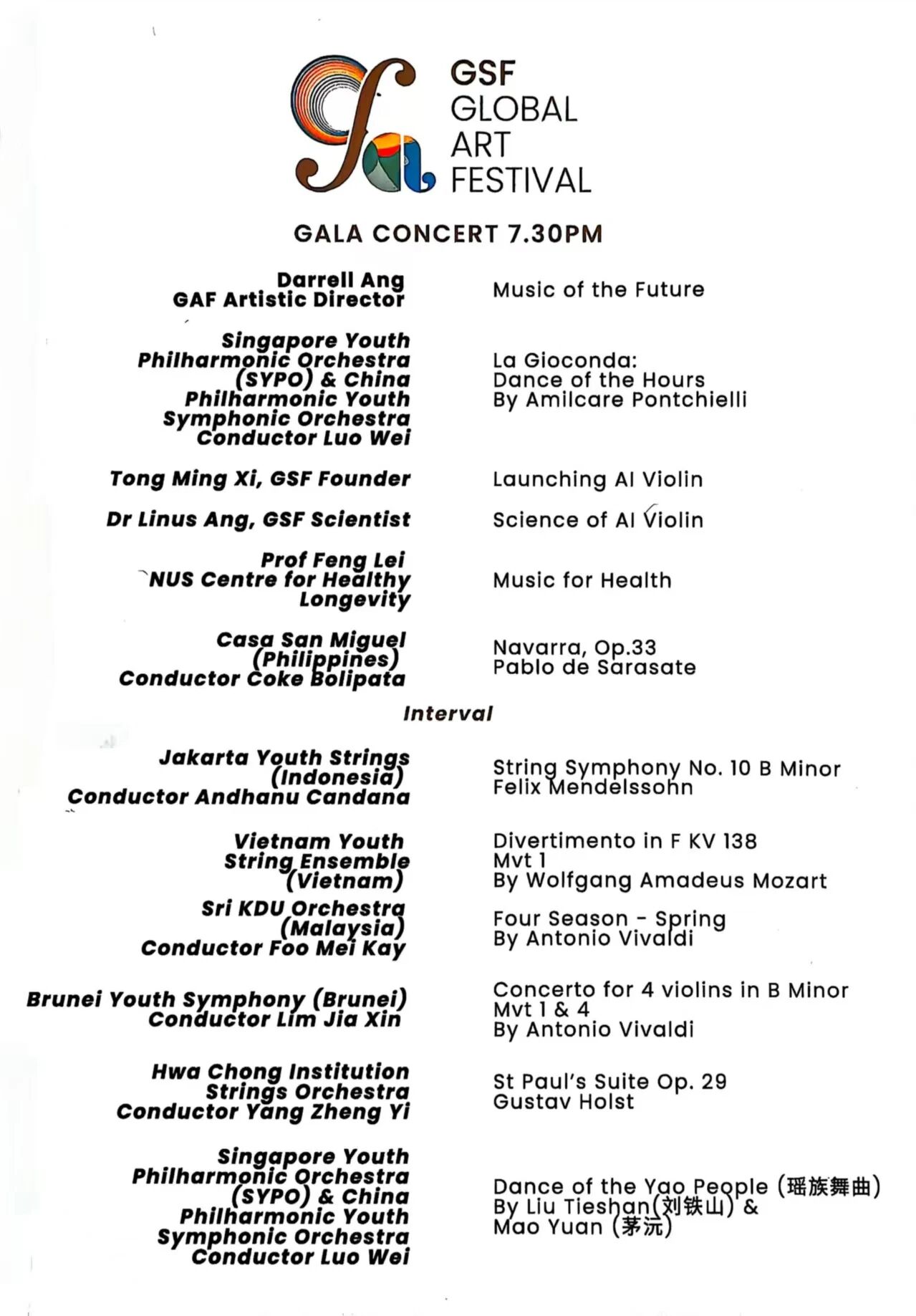 指挥洪毅全(Darrel Ang)为GAF(Global Art Festival)艺术总监。他毕业于美国耶鲁大学,在2007年第50届贝桑松国际指挥比赛中获得了特等奖、观众奖和管弦乐队奖。以及,在第九届安东尼奥·佩德罗蒂国际指挥比赛,和第八届阿图罗·托斯卡尼尼国际指挥比赛中,获得了一等奖。他被誉为当代亚洲曲目最重要的诠释者之一,经常在世界各地指挥陈毅、谭盾、周龙、陈其刚、杨一桑和已故竹光彻的作品。