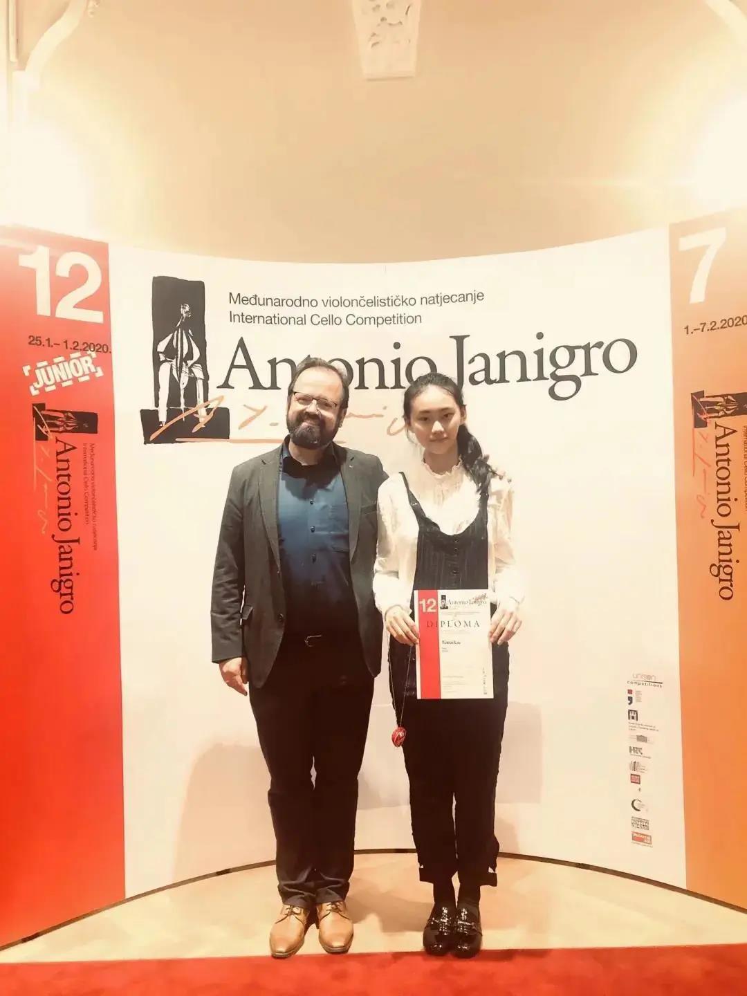 杨尼格洛国际青少年大提琴比赛是最著名的国际大提琴比赛之一,是为纪念著名意大利大提琴家安东尼奥·杨尼格洛所举办的。杨尼格洛出生于意大利米兰,自1939年起定居于克罗地亚首都萨格勒布,致力于推动音乐活动与音乐教育长达30年。比赛分为成人比赛和青少年比赛,经过严格筛选,来自全球26个国家148名青少年大提琴高手集聚克罗地亚首都萨格勒布。比赛在近200年建筑历史的克罗地亚音乐学院音乐厅举行。经过激烈角逐,刘天紫同学以突出的个性和感染力,赢得评委们的高度赞赏,也给现场观众留下深刻的印象。评委的评价是有着强劲的爆发力,难以捕捉的音乐感和魔力。